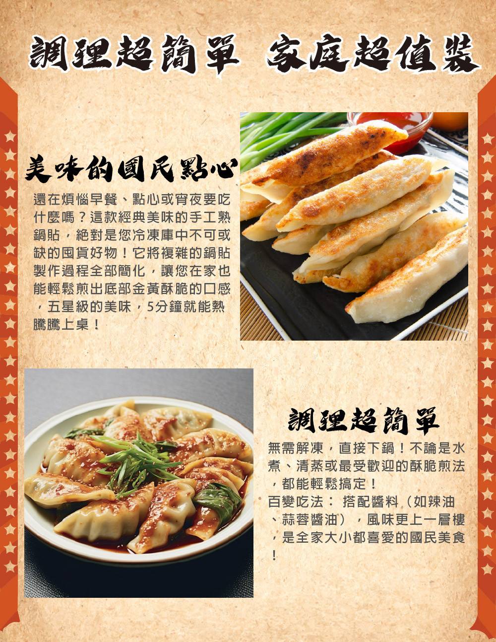 還在煩惱早餐、點心或宵夜要吃什麼嗎?這款經典美味的手工熟鍋貼,絕對是您冷凍庫中不可或缺的囤貨好物!它將複雜的鍋貼製作過程全部簡化,讓您在家也能輕鬆煎出底部金黃酥脆的口感,五星級的美味,5分鐘就能熱騰騰上桌!