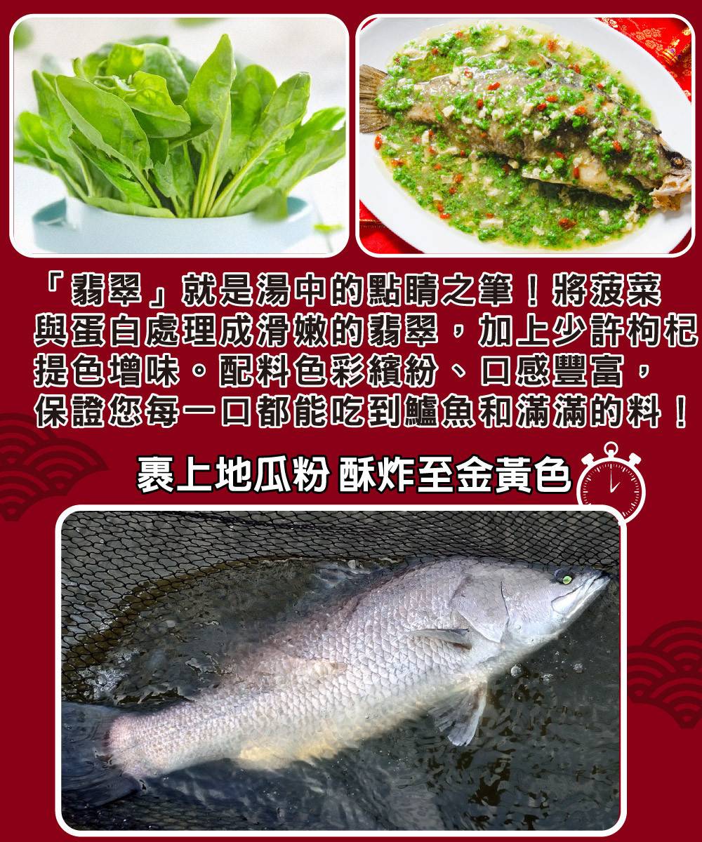 🌱 翡翠與枸杞的點綴: 「翡翠」就是湯中的點睛之筆!將菠菜與蛋白處理成滑嫩的翡翠,加上少許枸杞提色增味。配料色彩繽紛、口感豐富,保證您每一口都能吃到鱸魚和滿滿的料!