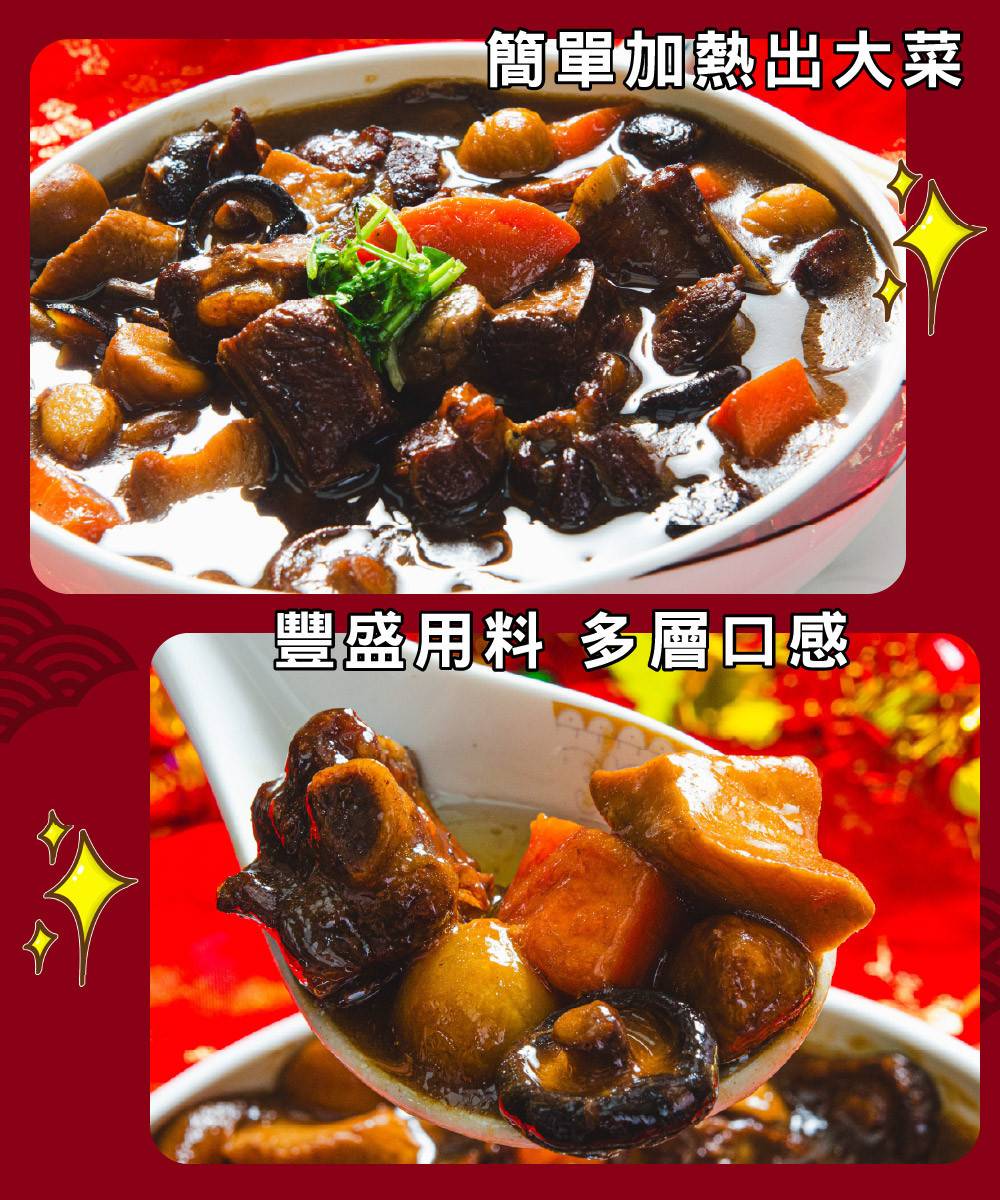 成分:排骨(台灣)、烏蔘、杏鮑菇、紅蘿蔔、栗子、香菇、蒜、素蠔油【水、白糖、醬油(水、大豆、鹽、玉米澱粉)、鹽、粘稠劑(乙醯化己二酸二澱粉)、酵母萃取物(酵母萃取物、鹽、水)、著色劑(焦糖色素)、乾菇粒】、雞肉粉(含迷迭香萃取物),香料,酵母萃取物(含麥芽糊精),雞油,(含迷迭香萃取物)】、香油(大豆沙拉油芝麻油)、水、糖、五香粉(肉桂、小茴香、胡荽、丁香、八角 、 香芹)