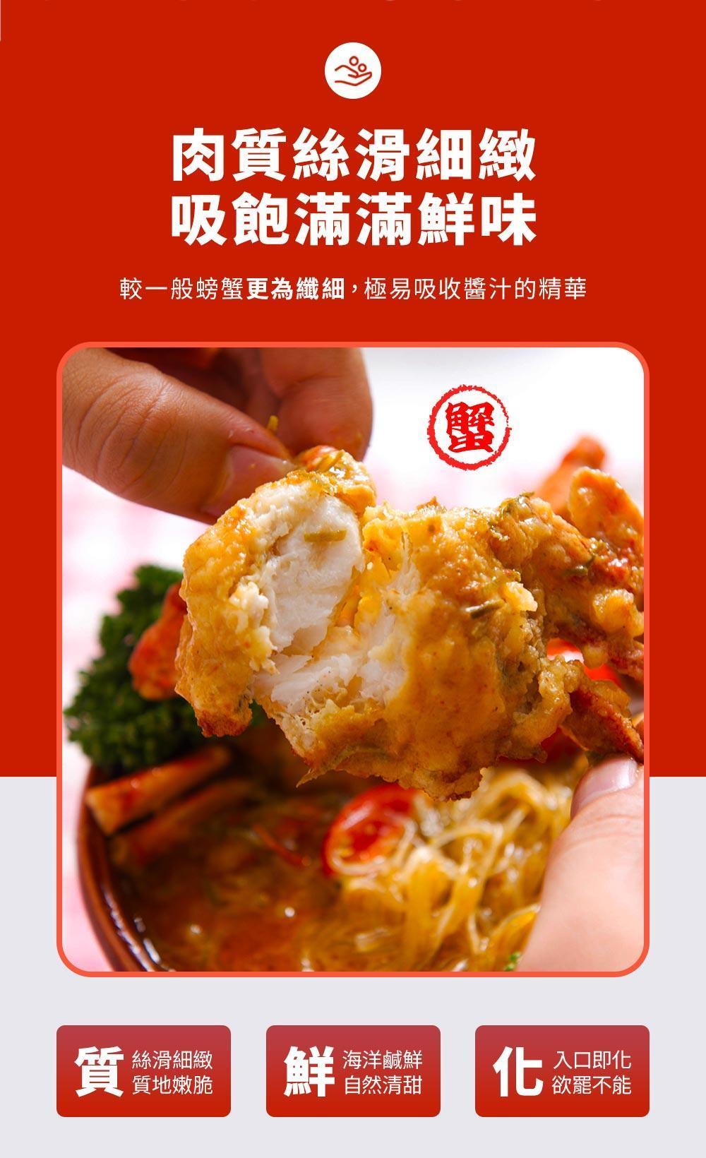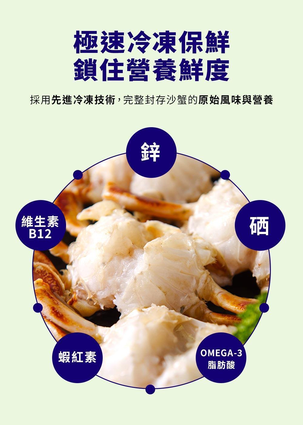 極速冷凍保鮮,鎖住初捕鮮度 採用先進冷凍技術,完整封存沙蟹的原始風味與營養,加熱後依舊維持如現捕般的細嫩口感。