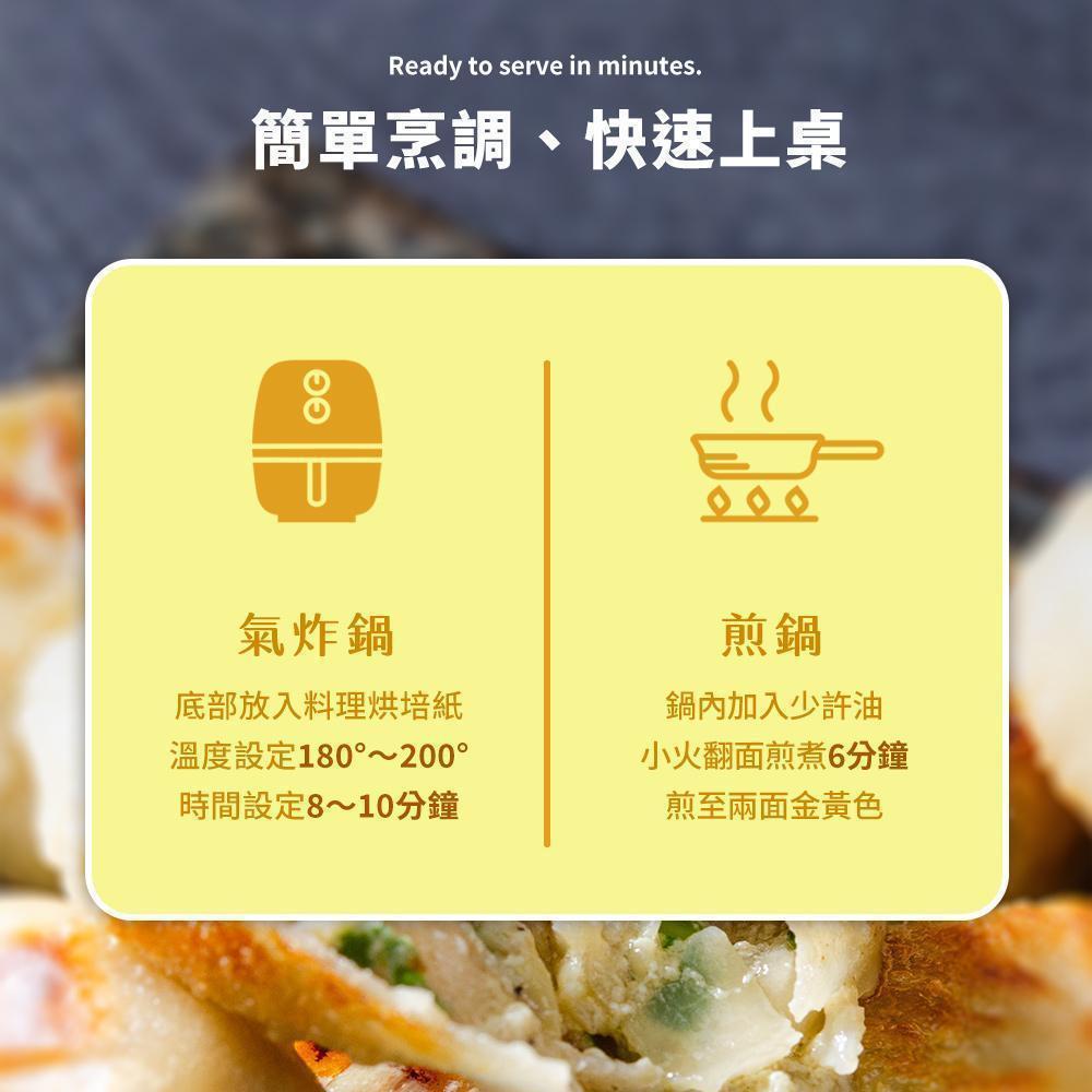 建議料理方式:平底鍋內油加熱後加入煎餡餅,以小火煎約3~5分鐘,至餡餅餅皮呈金黃色即可。